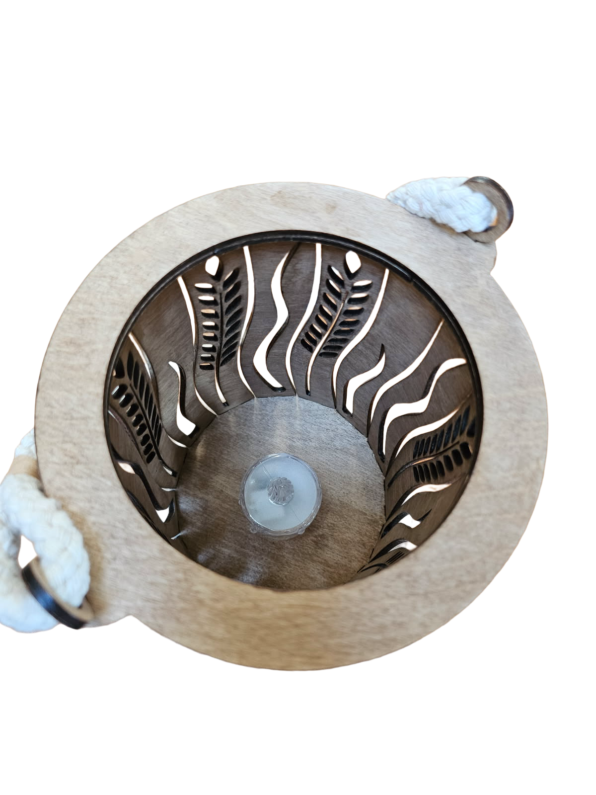 Sa forme cylindrique laisse filtrer délicatement la lumière d'une bougie chauffe-plat (fournie), créant une ambiance douce et apaisante. Une corde tressée blanche avec attaches en bois ajoute une note rustique et permet de le transporter ou de le suspendre facilement.